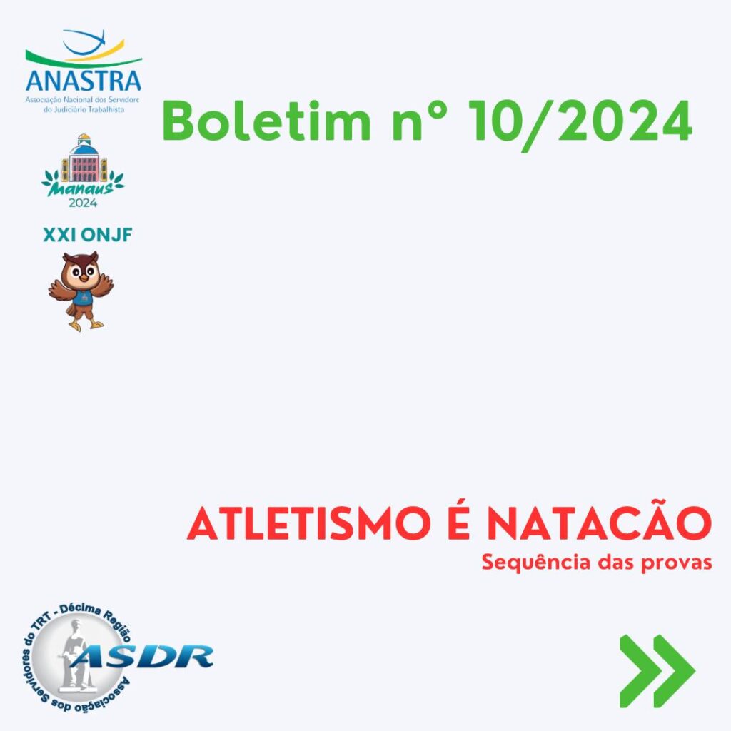 Boletim 10/2024 – Sequência das provas de natação e atletismo – ONJF 2024 Manaus/AMNotícias A sequência das provas de natação e atletismo para a 21ª Olimpíada Nacional do Judiciário Federal (ONJF) está disponível. CONFIRA ABAIXO Atletismo Natação