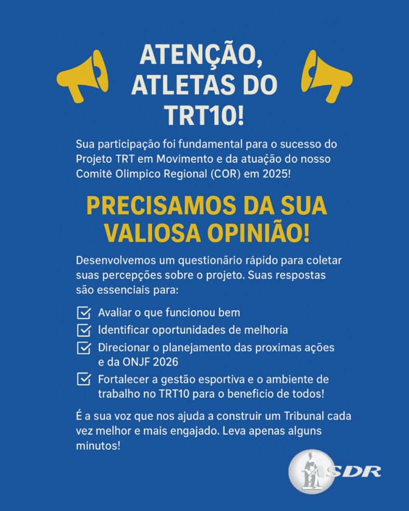 Sua participação foi fundamental para o sucesso do Projeto TRT em Movimento e da atuação do nosso Comitê Olímpico Regional (COR) em 2025! Agora, precisamos da sua valiosa opinião para aprimorar ainda mais nossas iniciativas de saúde, bem-estar e integração.