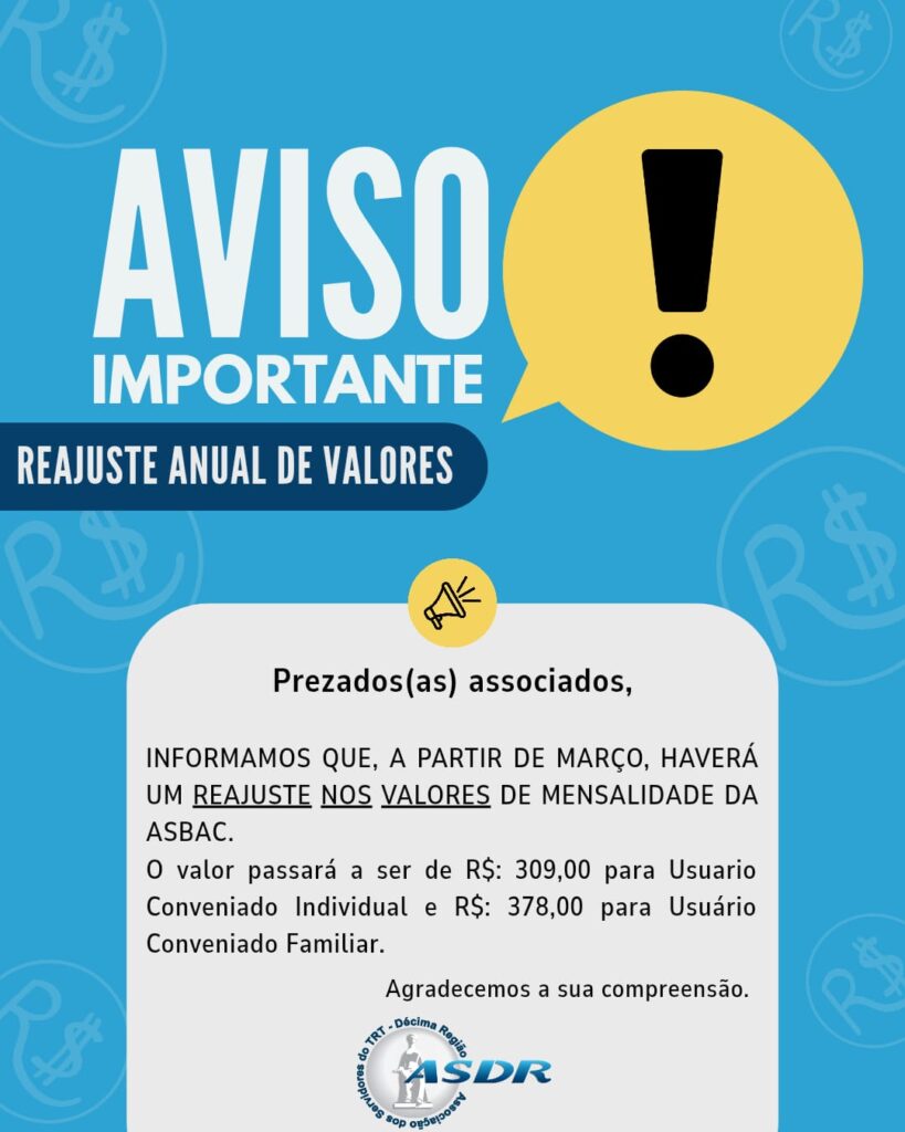Informamos que houve reajuste anual nos valores da mensalidade da ASBAC, conforme atualização realizada pelo próprio clube.