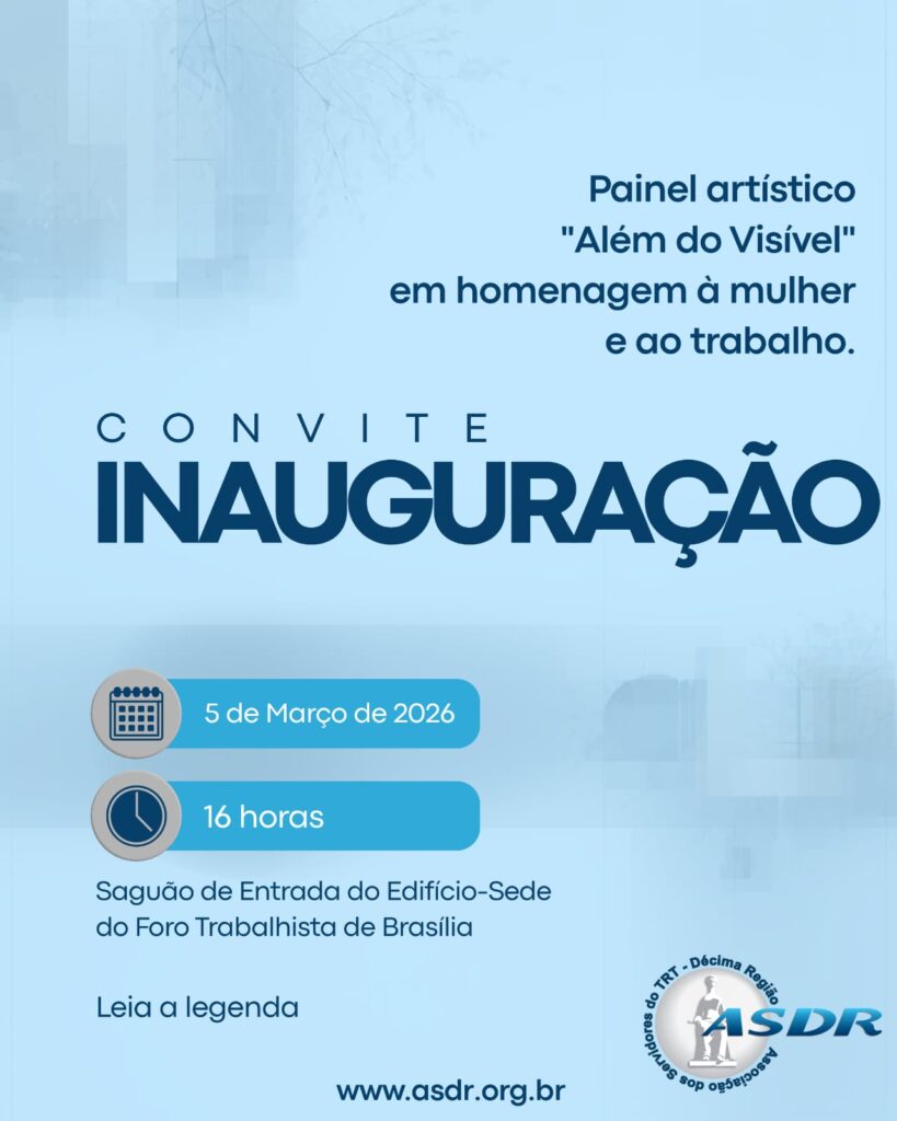 A Diretoria do Foro Trabalhista de Brasília convida magistrados, servidores, colaboradores e público interno para a solenidade de inauguração do painel artístico “Além do Visível”, cujo tema é “A Mulher e o Trabalho”.